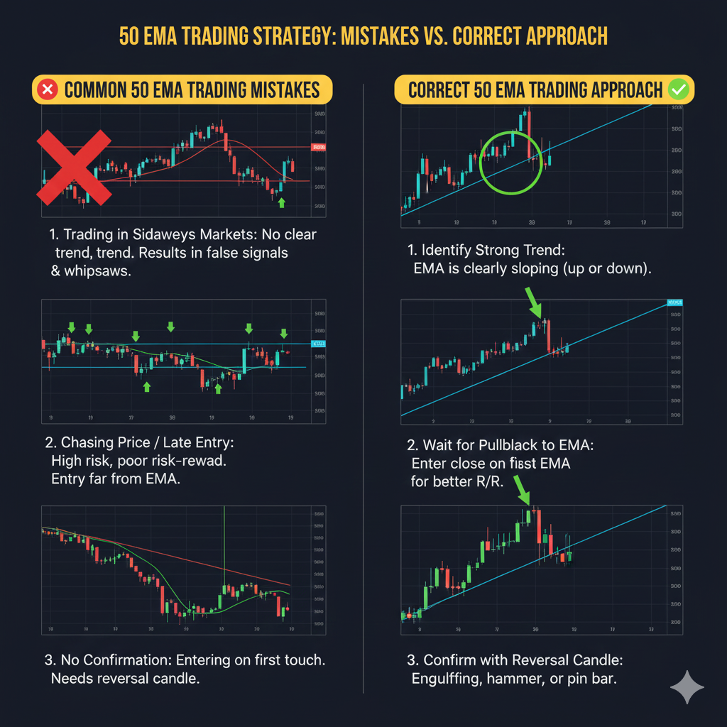 The key insight: The 50 EMA is a trend-following tool. It excels in trending markets and struggles in ranging markets.